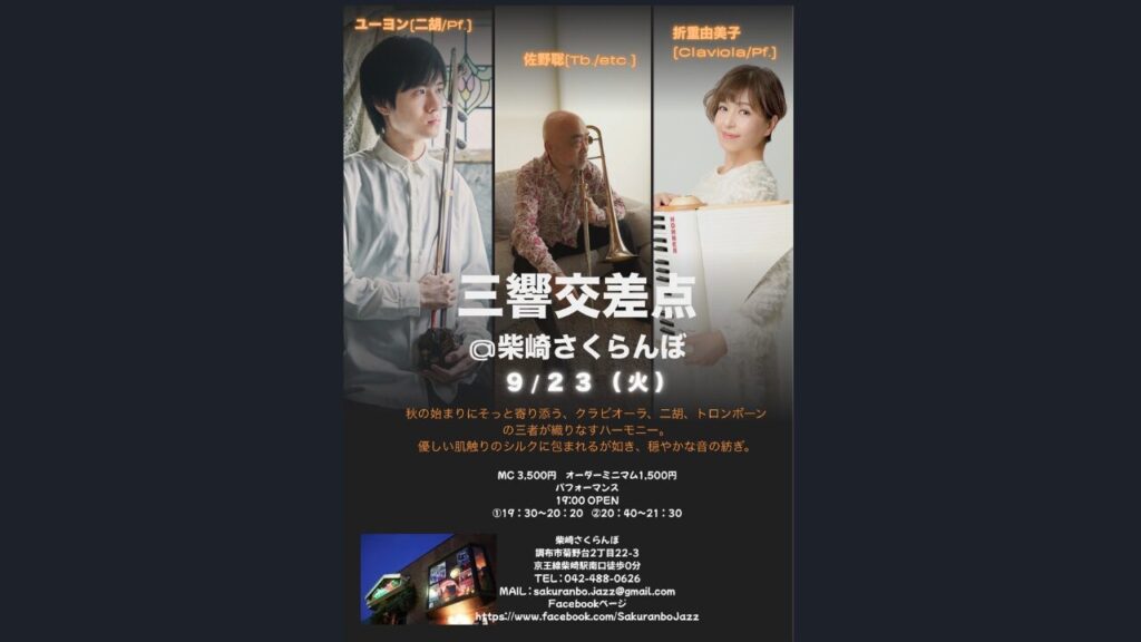 今回は心血を注いで準備してきた、二胡奏者ユーヨンのライブステージ情報をお届けします! クラビオーラ、二胡、トロンボーンという、おそらく日本では私たちしかやっていない、珍しい編成でのライブです。 この3つの楽器が織りなすのは、秋の始まりにそっと寄り添う、穏やかなハーモニー。 まるで上質なシルクにそっと包まれるような、心安らぐ時間になるはずです。